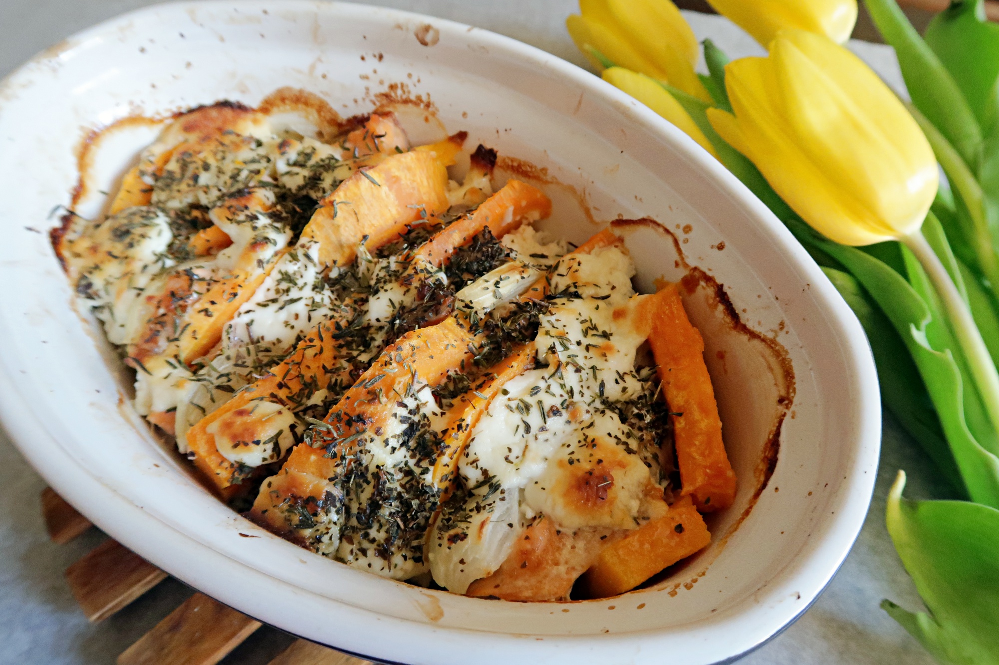Ekspresowa zapiekanka z batata i łososia. Przepyszny, pełnowartościowy posiłek, który jest bardzo prosty do przyrządzenia. Cała filozofia zapiekanki polega na tym, aby w misce poukładać plastry łososia, batata oraz cebuli. Dodatek serka koziego lub fety nadaje potrawie wyrazistego i niepowtarzalnego smaku. Jest to jeden z moich ulubionym przepisów, który często przyrządzam na kolację. Wypróbuj, na pewno nie pożałujesz.