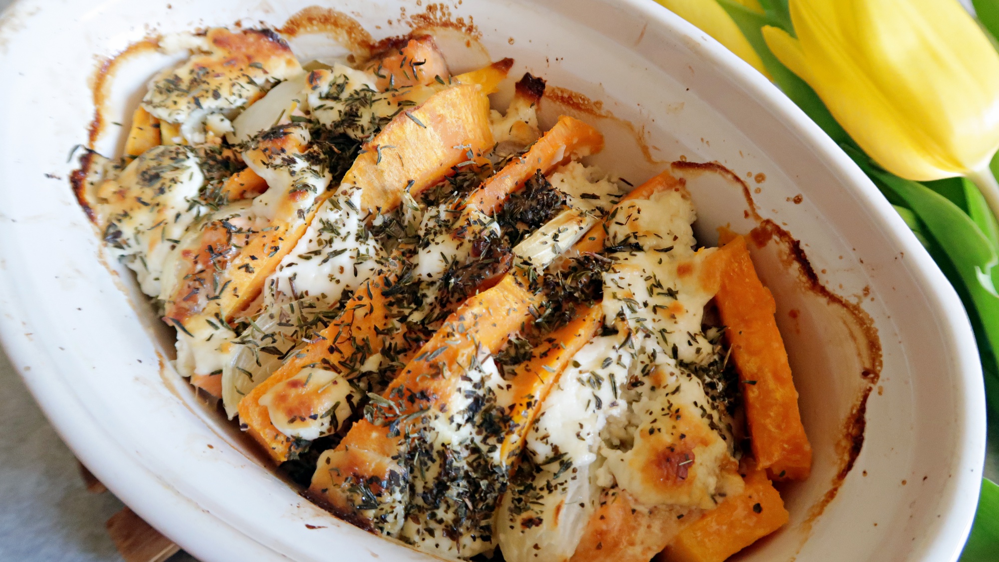 Ekspresowa zapiekanka z batata i łososia. Przepyszny, pełnowartościowy posiłek, który jest bardzo prosty do przyrządzenia. Cała filozofia zapiekanki polega na tym, aby w misce poukładać plastry łososia, batata oraz cebuli. Dodatek serka koziego lub fety nadaje potrawie wyrazistego i niepowtarzalnego smaku. Jest to jeden z moich ulubionym przepisów, który często przyrządzam na kolację. Wypróbuj, na pewno nie pożałujesz.